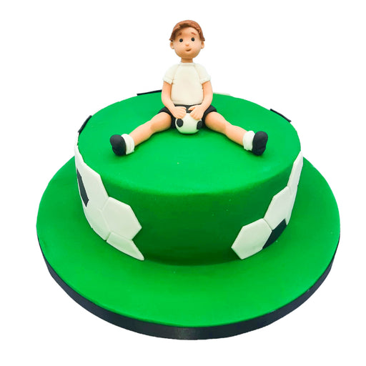 Football with Character cake Calling all football fanatics ! This adorable green fondant cake is complete with a boy figurine completely made from...